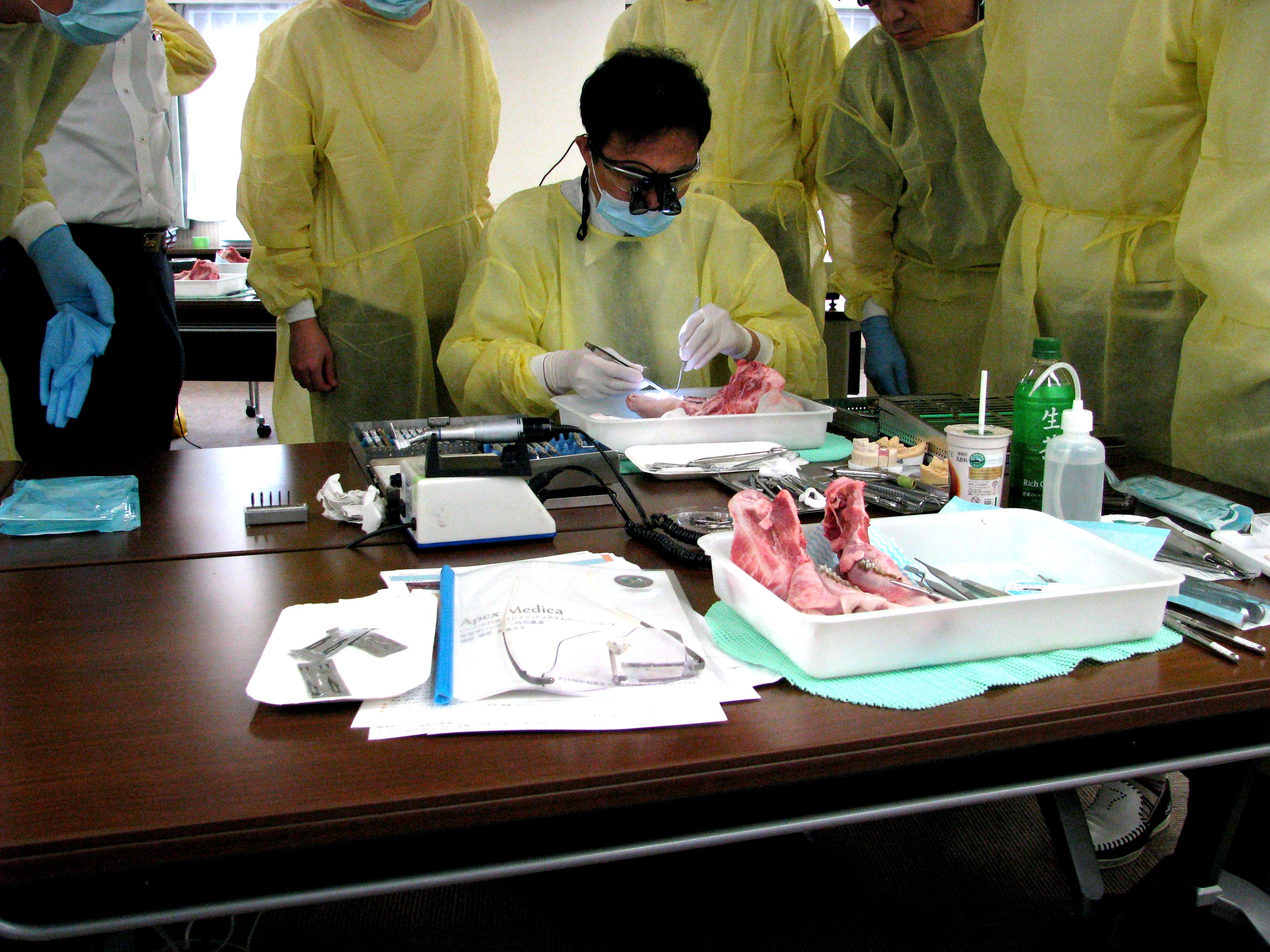講習会は、いつも通り午前中はスライドを用いての講義、午後より豚骨を用いての実習を行いました。