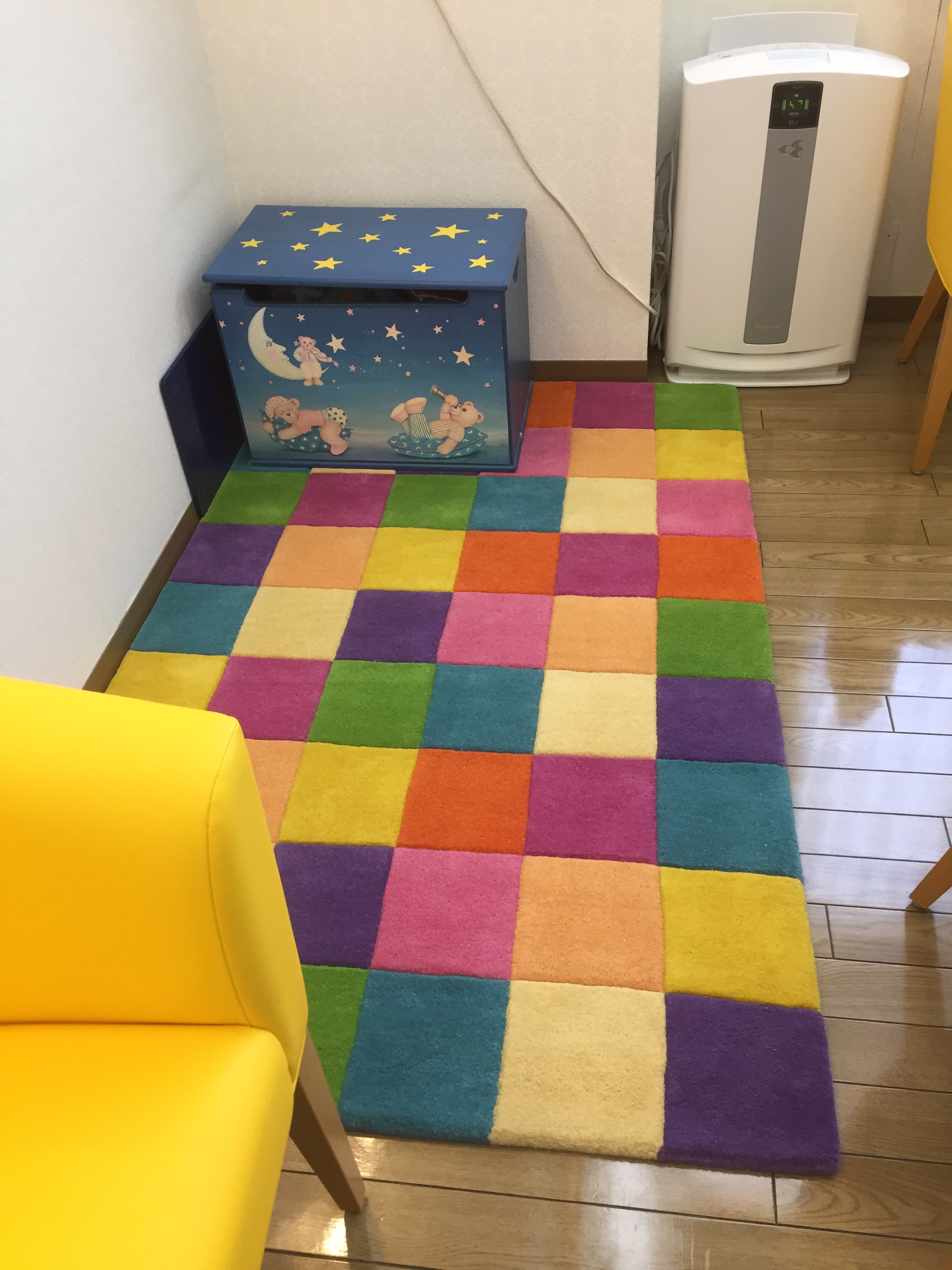 椅子を注文した後、配置をどうしようかといろいろ考えながら、毎日お待ちいただいている皆様のご様子を伺っていたところ、小さなお子様がおもちゃ箱からおもちゃを取り出し、ソファーの上で広げて遊んでいると、近くにお座りの方がさっと離れた場所へ移動なさったのをお見掛けし、お子様専用のブースも設けようと思い立ちました。新たな部屋を設けることはできないため、カーペットを敷きその上におもちゃ箱を置くこととしましたが、確保できるスペースにちょうどよい適度な大きさのカーペットを見つけるのにひと月ほど要しました。
